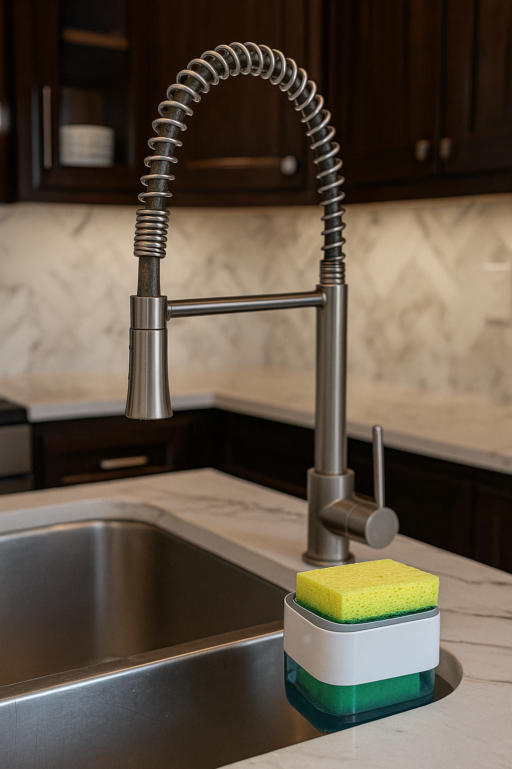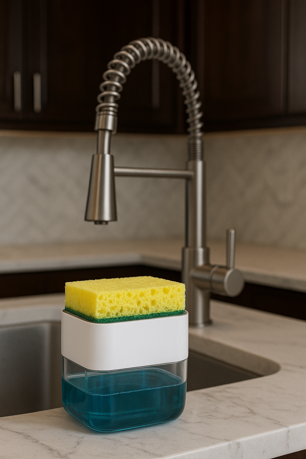 ¡Dile adiós al desorden en tu cocina y ahorra tiempo en cada lavado! Este 2 en 1 combina dispensador de jabón + soporte para esponja en un diseño práctico, moderno y resistente.